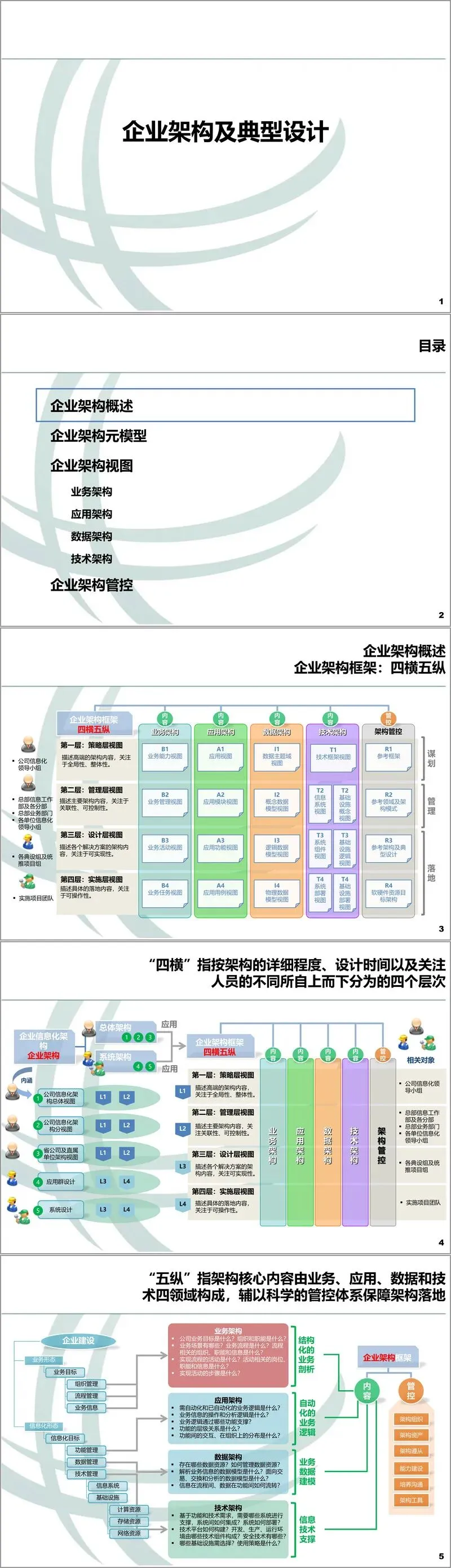 本文件系统性地阐述了一套成熟、完整的企业架构框架与方法论,旨在为大型企业的数字化转型提供清晰的顶层设计和实施指引。该框架的核心思想可概括为“四横五纵”的结构,构成了企业架构的坚实骨架。