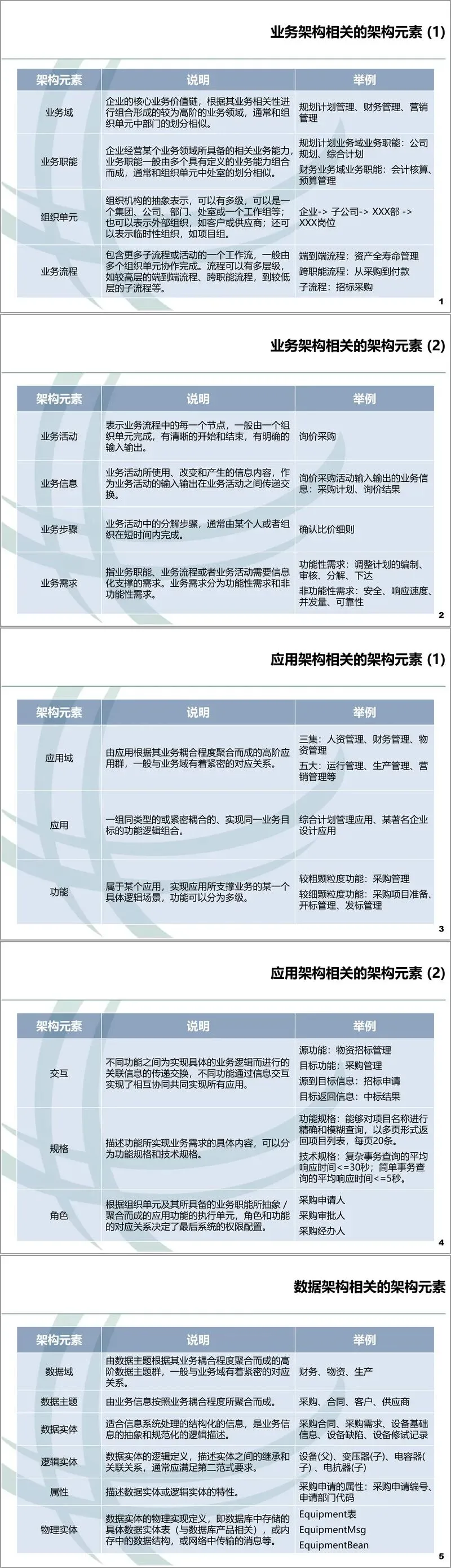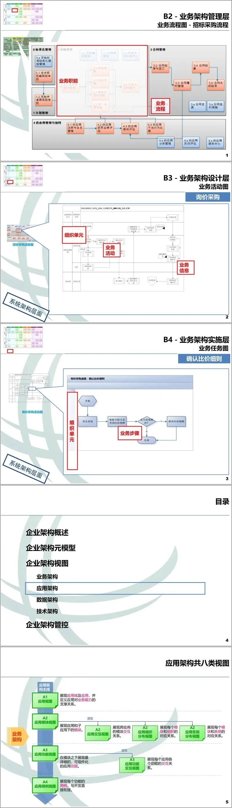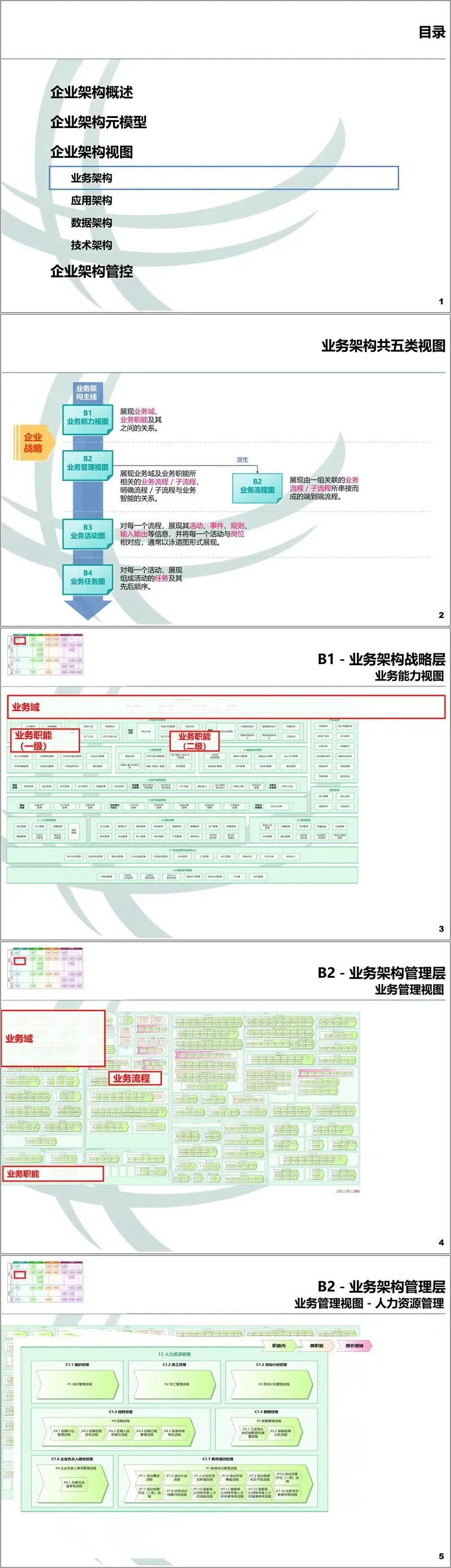 在业务架构领域,文件定义了从业务域、业务职能到业务流程、业务活动乃至业务步骤的详细元素。其视图分为五类,包括展现高阶业务能力的B1视图、描述业务流程管理的B2视图、详细刻画活动与组织单元关系的B3业务活动图,以及分解具体任务的B4业务任务图。这些视图共同描绘了企业的业务运作全景。
