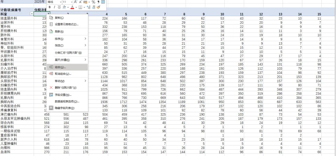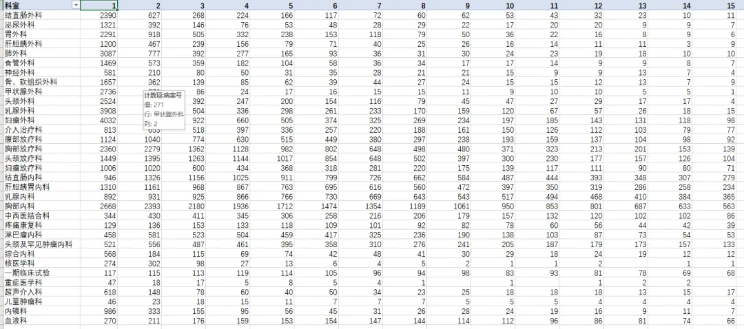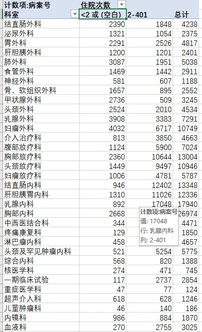 拿到住院患者数据后,他熟练地创建了一个数据透视表:行标签放科室,列标签放住院次数,数值区域放患者计数。几秒钟后,一个整齐的表格出现了。