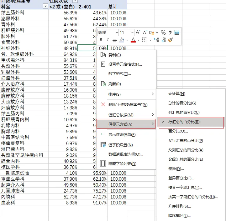 在「值显示方式」选项卡中,他从容地选择「行汇总的百分比」。几秒钟后,一个完美的首次住院患者占比报表呈现在屏幕上。