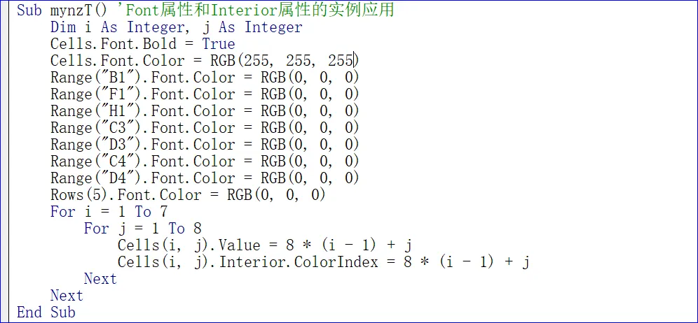 Sub mynzT() 'Font属性和Interior属性的实例应用