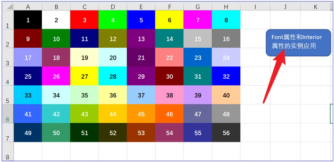 Interior的ColorIndex属性允许访问包含56种颜色的调色板,这个例子我们要通过一段代码在工作表中显示各种数值对应的颜色,并将数值写在对应的单元格上,字体的颜色为白色,对于一些显示不清楚的单元格字体设置为黑色。