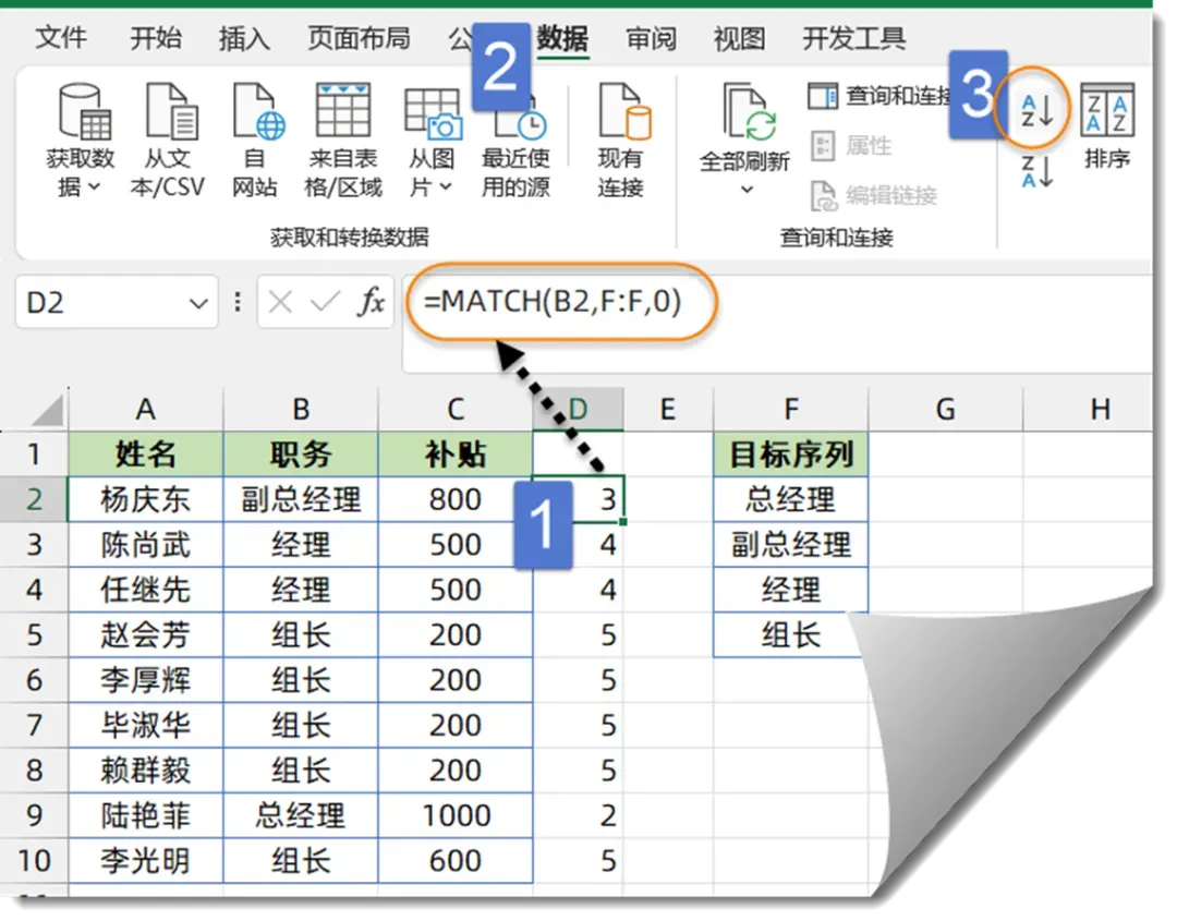 MATCH函数,在F列中查询B2单元格职务所处的相对位置,并返回表示位置的数字。最后对这些数字进行升序排序,最终得到和F列相同的顺序。