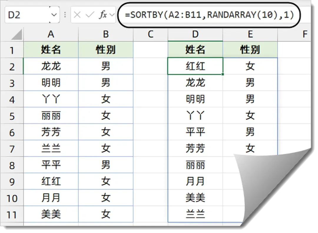 SORTBY函数的排序区域为A2:B11单元格中的数据,排序依据是按随机数数组升序排序。因为公式每次刷新所生成的随机数数组是不确定的,所以A2:B11单元格中的数据也会得到随机的排序效果。