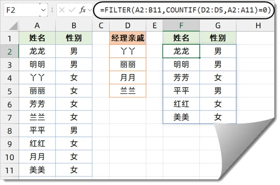 如下图所示,左侧是员工信息,D列是经理亲戚。需要在F列提取出所有不是经理亲戚的员工名单。