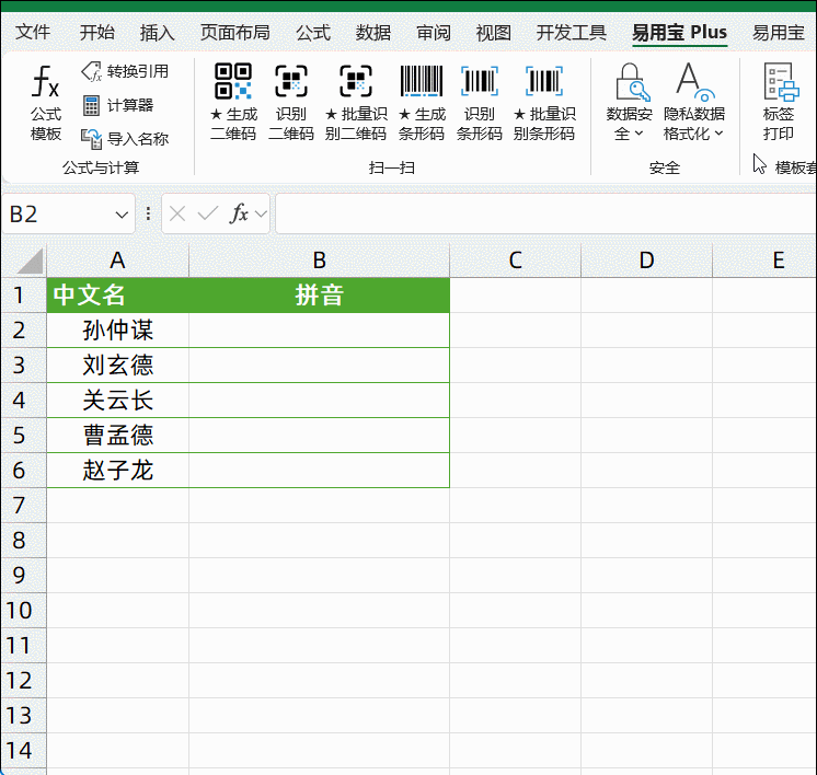 如下图所示,要将A列中文姓名转成拼音,使用现成的公式模板就行: