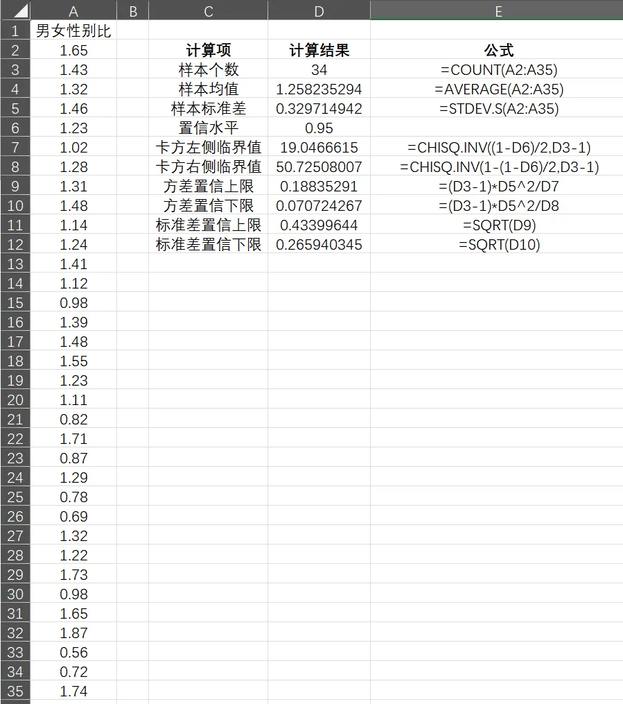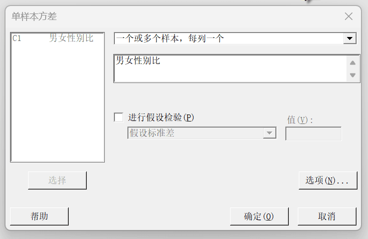 下面以某省34个地区人口的男女性别比为例创建一个数据,对其进行均值估计。34个地区人口的男女性别比的原始数据如图所示,数据中包含“男女性别比”一个变量,我们通过这34个地区男女性别比来估计该省总体男女性别比的方差。