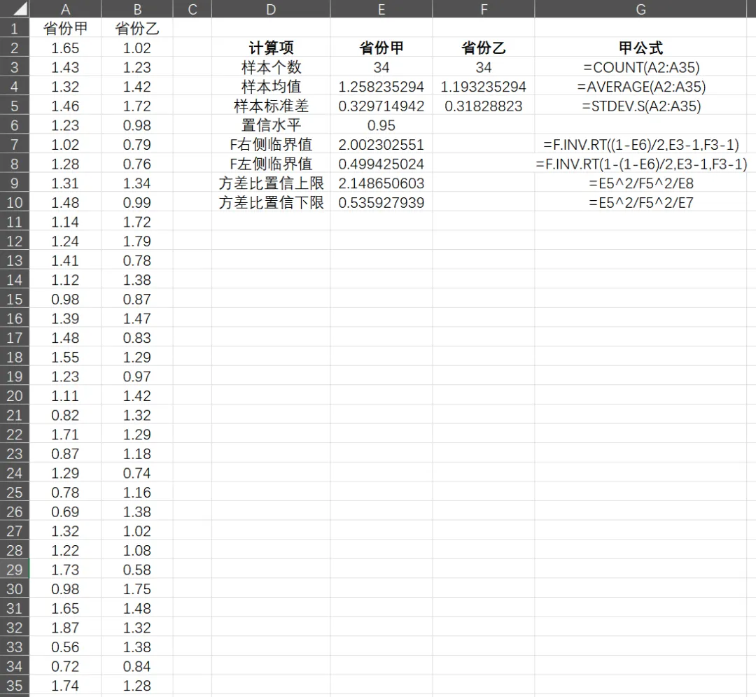 下面以某两个省34个地区人口的男女性别比为例创建一个数据文件,对其进行总体方差之比的估计。两个省男女性别比的原始数据如图所示,数据中包含“省份甲”和“省份乙”两个变量,我们通过对这两个样本的分析来估计该两个省份总体男女性别比的总体方差之比。