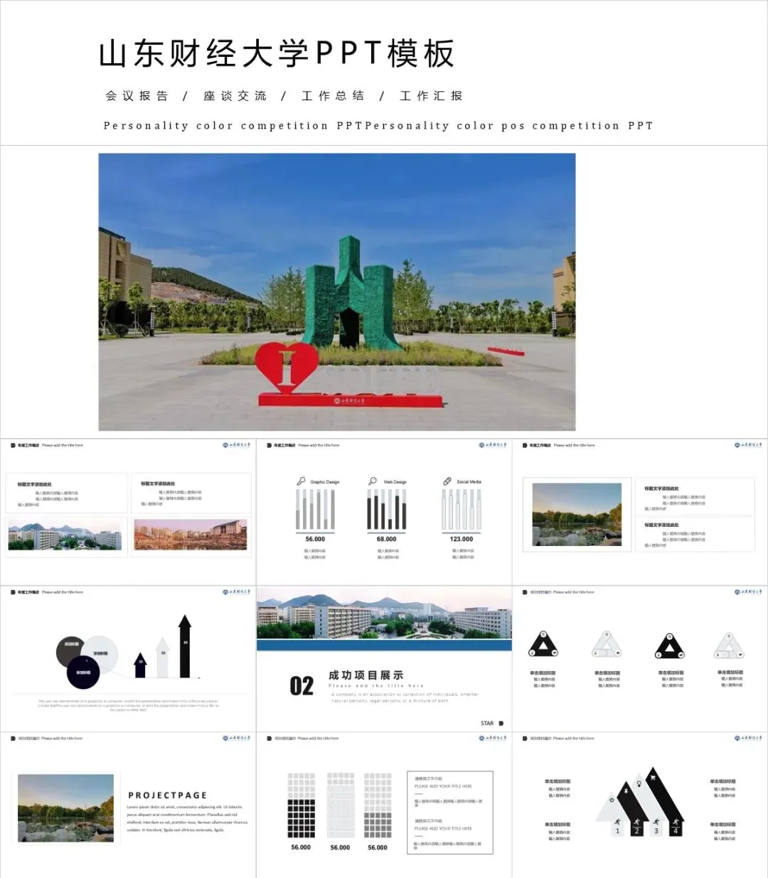以上是我们为大家准备的山东财经大学专属PPT模板,文中的所有板式都是可编辑的,大家可以上传替换自己喜欢的校园美景,做出具有自己风格的专属PPT哦!其他同学也可以给我留言