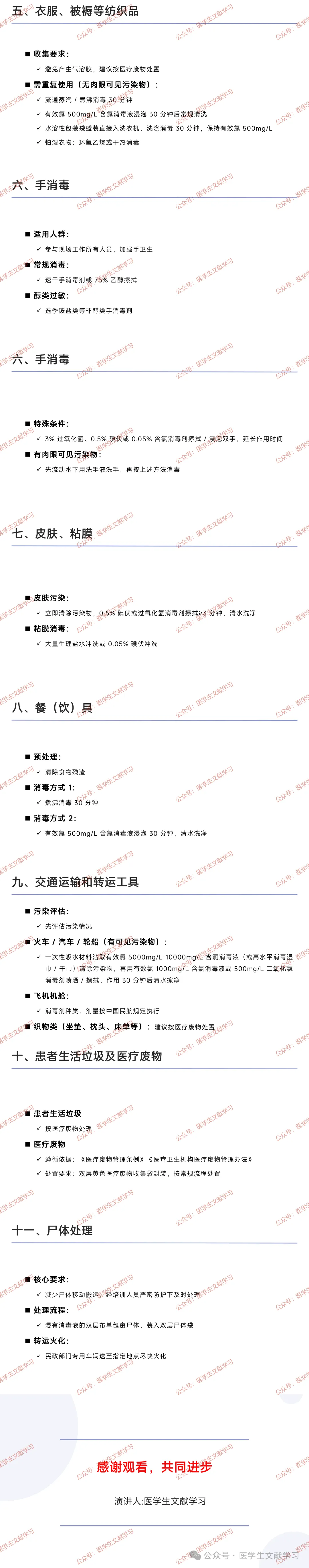 - 终末消毒:适用于病例离开后(住院、转院、出院、死亡),覆盖病例居住 / 活动过的场所(居所、诊疗场所、转运工具等)及相关污染物品。
