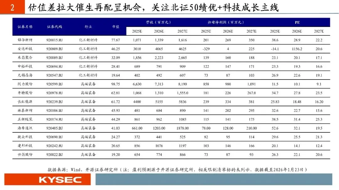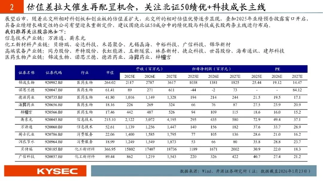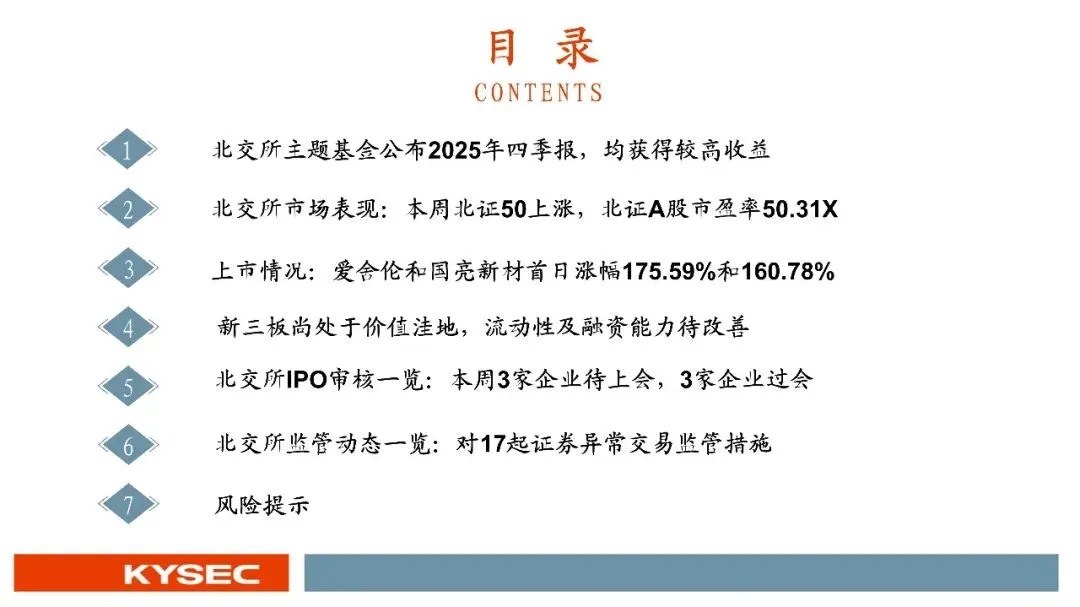 重仓资金规模稳步扩张2025年末公募重仓北交所金额达90.59亿元,占比0.12%2025年四个季度末重仓金额分别为67.43亿、98.92亿、103.07亿和90.59亿元,占比区间0.11%–0.17%被动资金加速流入:北证50指数基金规模2022–2025年分别为29.40亿、27.69亿、77.79亿和139.32亿元;跟踪产品数量同步增至76只。主题基金表现亮眼2025年末北交所主题基金规模30.21亿元,全年平均收益率达55.53%,四季报对2026年市场保持积极态度。2026年投资主线判断:北交所聚焦“专精特新”小巨人,AI固态电池、商业航天、机器人等细分赛道仍具潜力。但在估值中枢抬升背景下,需降低估值扩张预期、更加重视业绩持续性。同时,部分研究覆盖不足的次新股存在结构性机会。