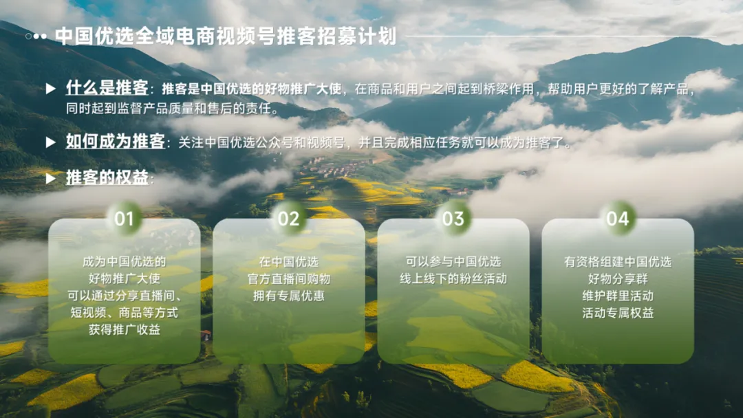 讲好中国故事,卖好中国产品,孵化中国IP,赋能中国企业,中国优选让每一个推客都可以享受到直播电商的时代红利。