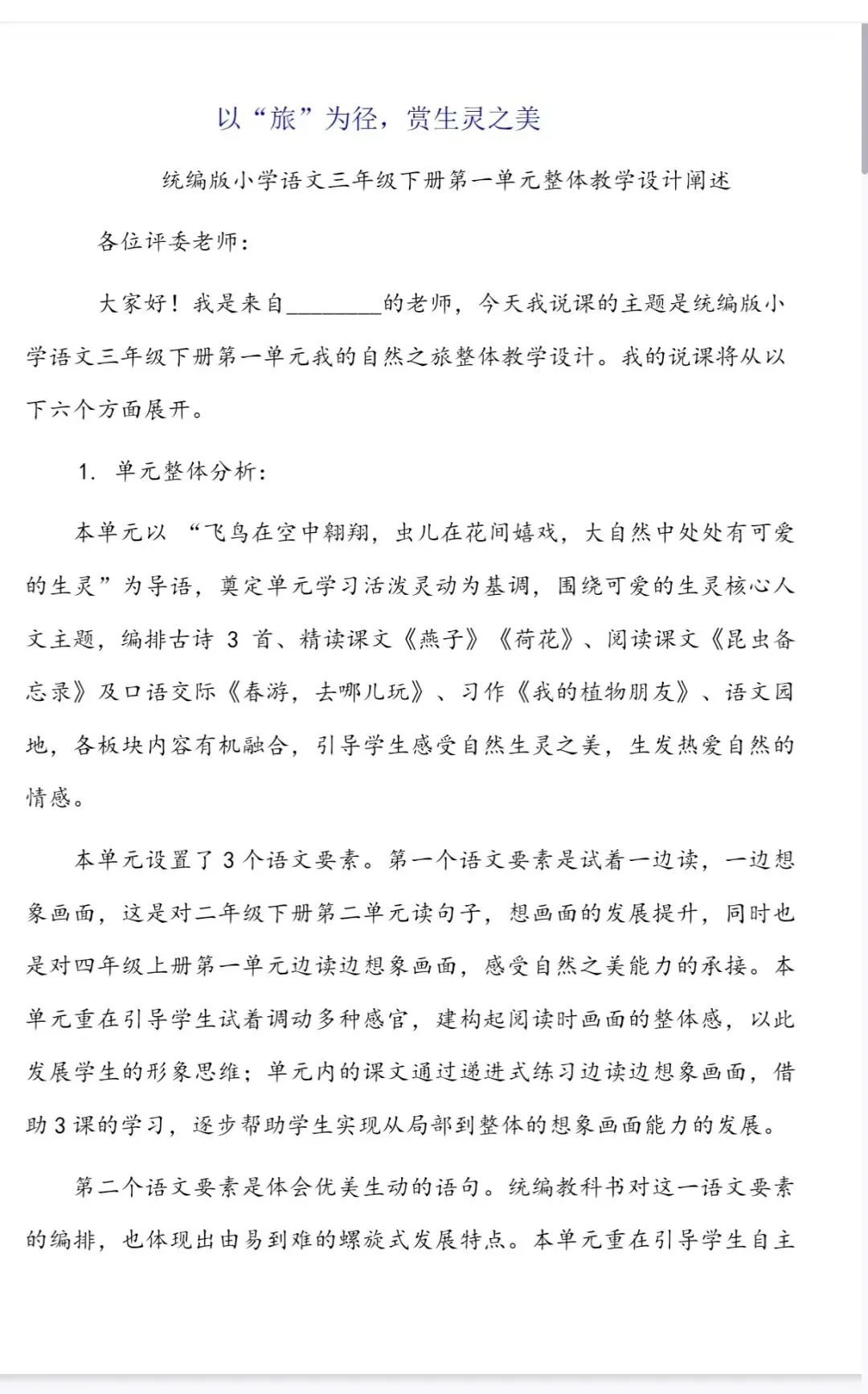 三年级下册语文第一单元大单元说课电子完整版有偿分享,不喜勿扰!