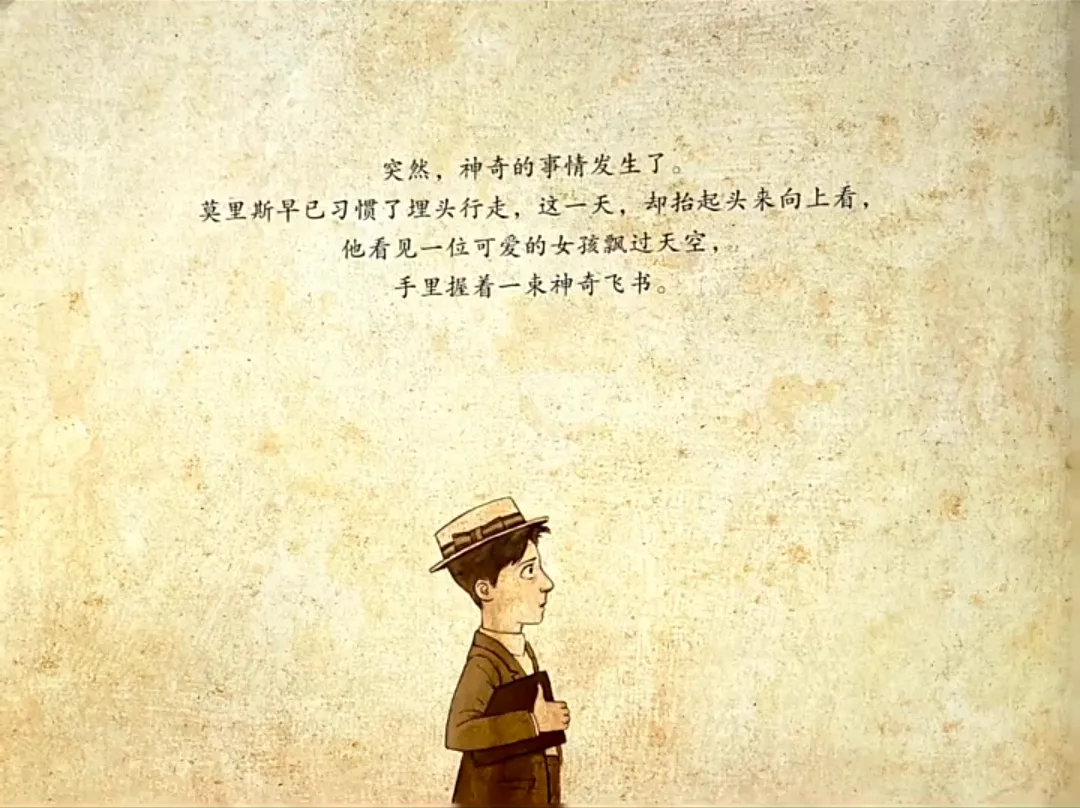 莫里斯想试试他的书是不是也能飞,结果不能他的书只能砰的一声摔落在地。飞翔的女孩知道莫里斯渴望着一个好故事,就把自己最珍爱的一本书送给了他。