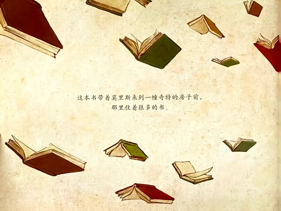 这本书非常友善,邀请莫里斯跟他走。这本书带着莫里斯来到一幢奇特的房子前,那里住着很多的书。