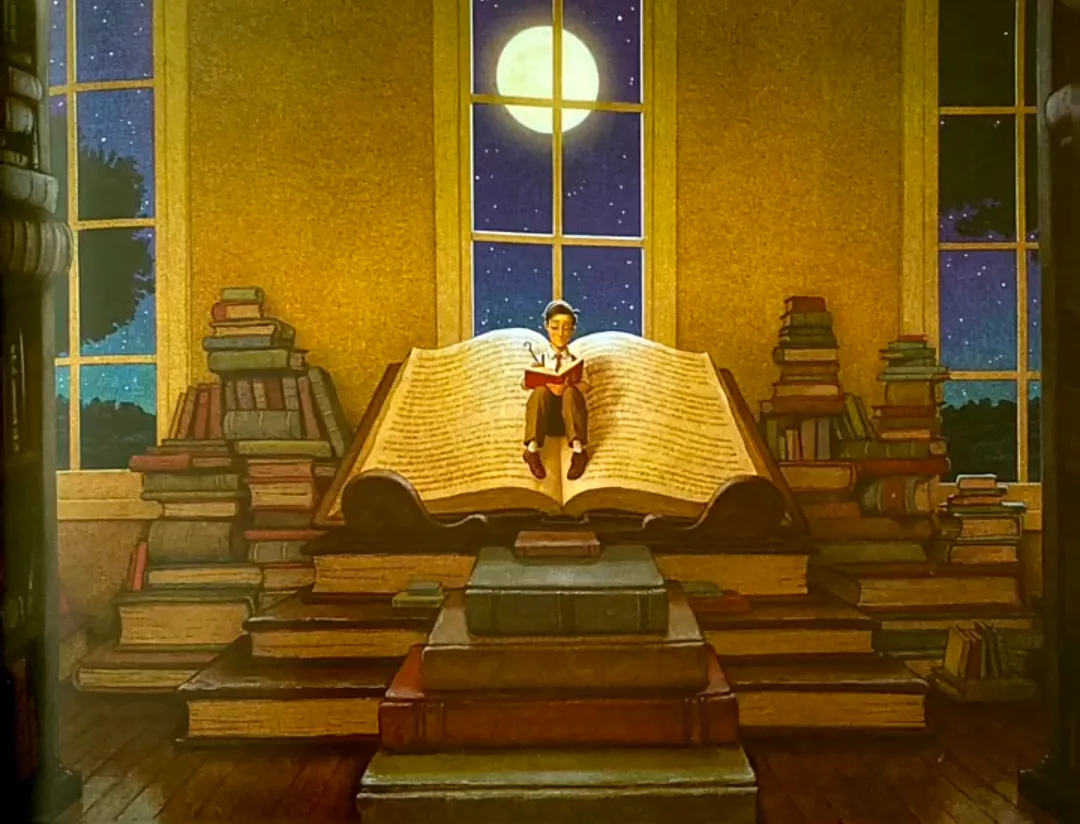 每天晚上,书籍们都把自己的故事读给莫里斯听。