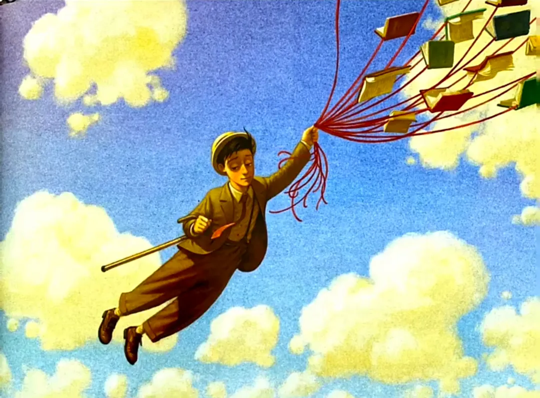 这一天却抬起头来向上看,他看见一位可爱的女孩飘过天空,手里握着一束神奇飞书。