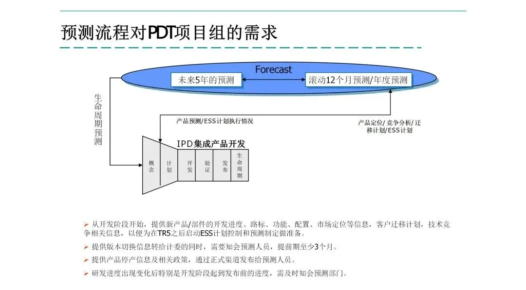 在预测流程中,IPD强调销售预测与要货预测的双重驱动。预测不仅是销售目标的数字体现,更是供应链各环节——包括产能规划、生产排程、采购备料——的核心输入。华为通过滚动预测机制,将市场机会分析、产品路标与供应链执行紧密衔接,形成“预测-计划-执行”闭环,从而在快速响应客户需求的同时,控制库存风险、保障交付质量。