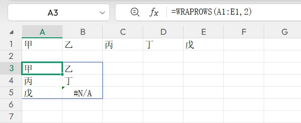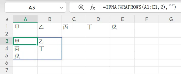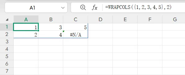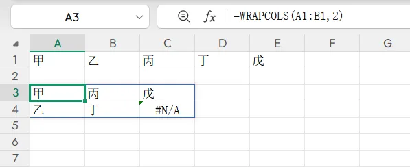 常量数组:如上面那样,直接用半角{}引用起来的一组数据,其中的数据(每一项都叫一个元素)都是常量。显然从例子中可以看到,同一行的数据之间用半角逗号分隔,不同行的数据用半角分号分隔。而且每一行的元素数目要相等,不相等会报错。区域数组:一个引用区域。下面的A1:B3(中间的冒号也是半角)就是区域数组,它引用了前面的内容。我们在使用求和函数SUM或者其它很多函数的时候就已经见到过了,只不过那时没有说“区域数组”这个名词而已。内存数组:有些公式计算结果也是数组,比如Filter的结果就是数组,其内容保存在内存中,这种数组就是内存数组,当然我们最终还是要把结果显示在单元格里。一维数组:可能是一行或者一列的一个区域,也可能是只包含一维数据的一个常量数组、或者函数计算结果。我将用几篇文章介绍常用的一些数组公式,包括函数和运算符。此函数可以把一维数组转化为二维数组,参数1是要转换的数组,参数2指定了每行有几个元素。如果参数1不是参数2的倍数时,所差部分会显示错误值#N/A。要避免这种情况,可以套上IFNA函数。它可以用于处理出现#N/A错误时用什么来代替这个错误值,比如下面就是用空字符串来代替。WRAPCOLS函数与WRAPROWS类似,所不同的是,第二个参数是指定每列有几行。注意WRAPROWS和WRAPCOLS在转化时有区别:前者是先填满一行再填下一行,后者是填满一列再填下一列。