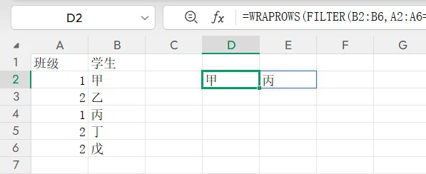 本例的Filter函数用于挑选班级=1的学生,要求每行三列,但是返回结果的元素个数少于指定的列数,WRAPROWS会自动减少占用区域。