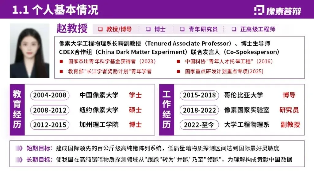 PPT 开篇展示申报者完整的教育与工作履历,从本科到博士均毕业于国际顶尖院校,现任大学物理系副教授、博士生导师,并拥有国家杰青、长江学者等重磅头衔,短期与长期研究目标明确,快速建立学术权威形象。