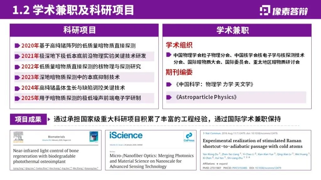 详细列举申报者近年来承担的国家重点研发计划、自然科学基金等国家级项目,同时展示其在国际学术组织的重要兼职及知名期刊编委身份,体现其在暗物质探测领域的活跃程度与行业认可度。