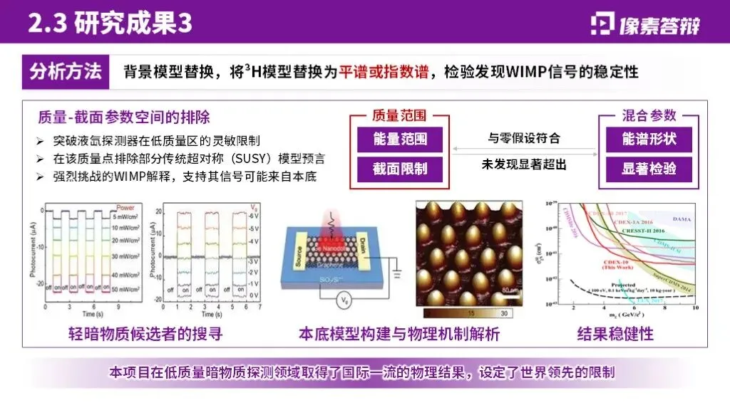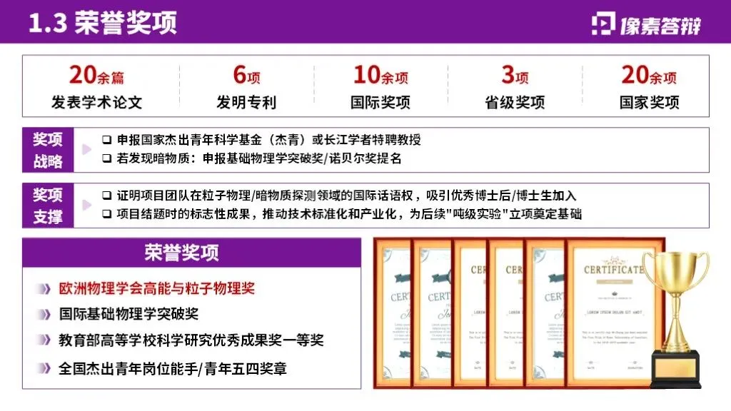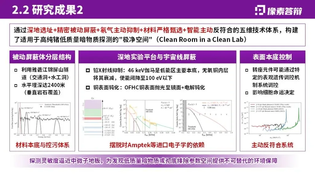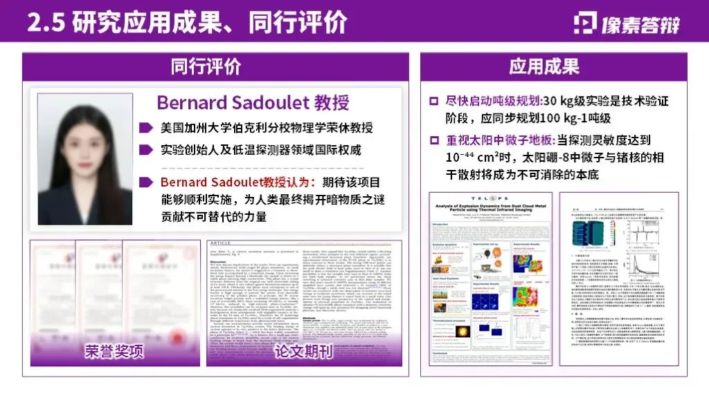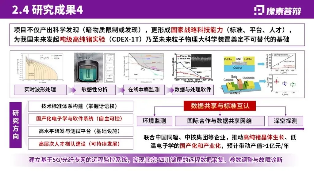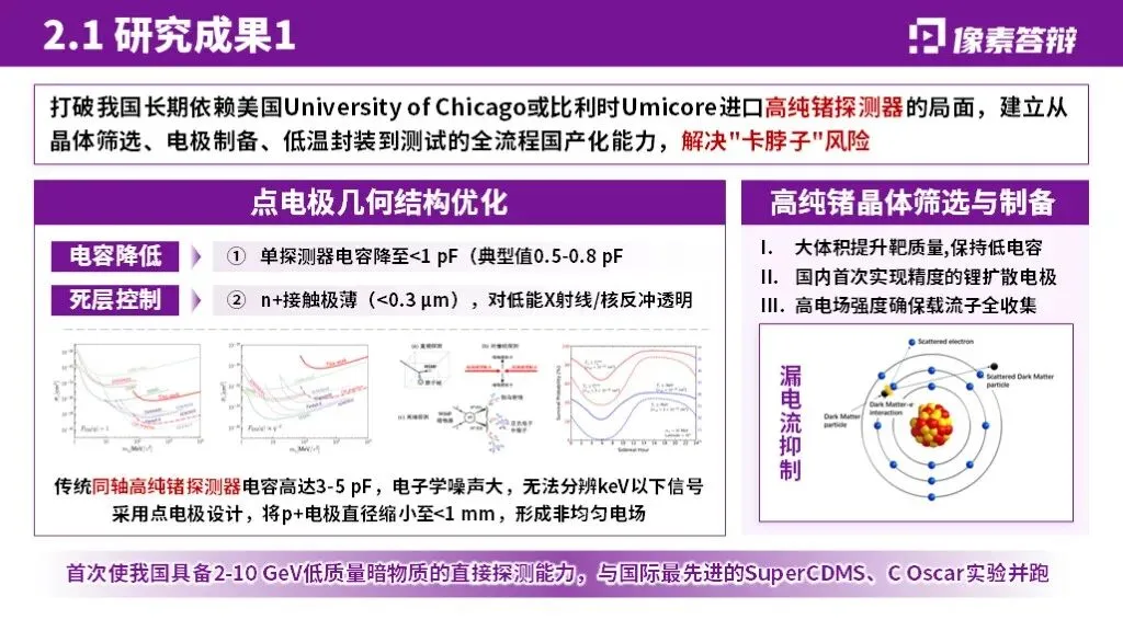 重点介绍申报者在暗物质探测领域的四项关键成果:实现高纯锗探测器全流程国产化,构建 “极净空间” 探测环境,取得国际一流的物理结果,以及形成国家战略科技能力,每项成果均突出技术创新性与应用价值。