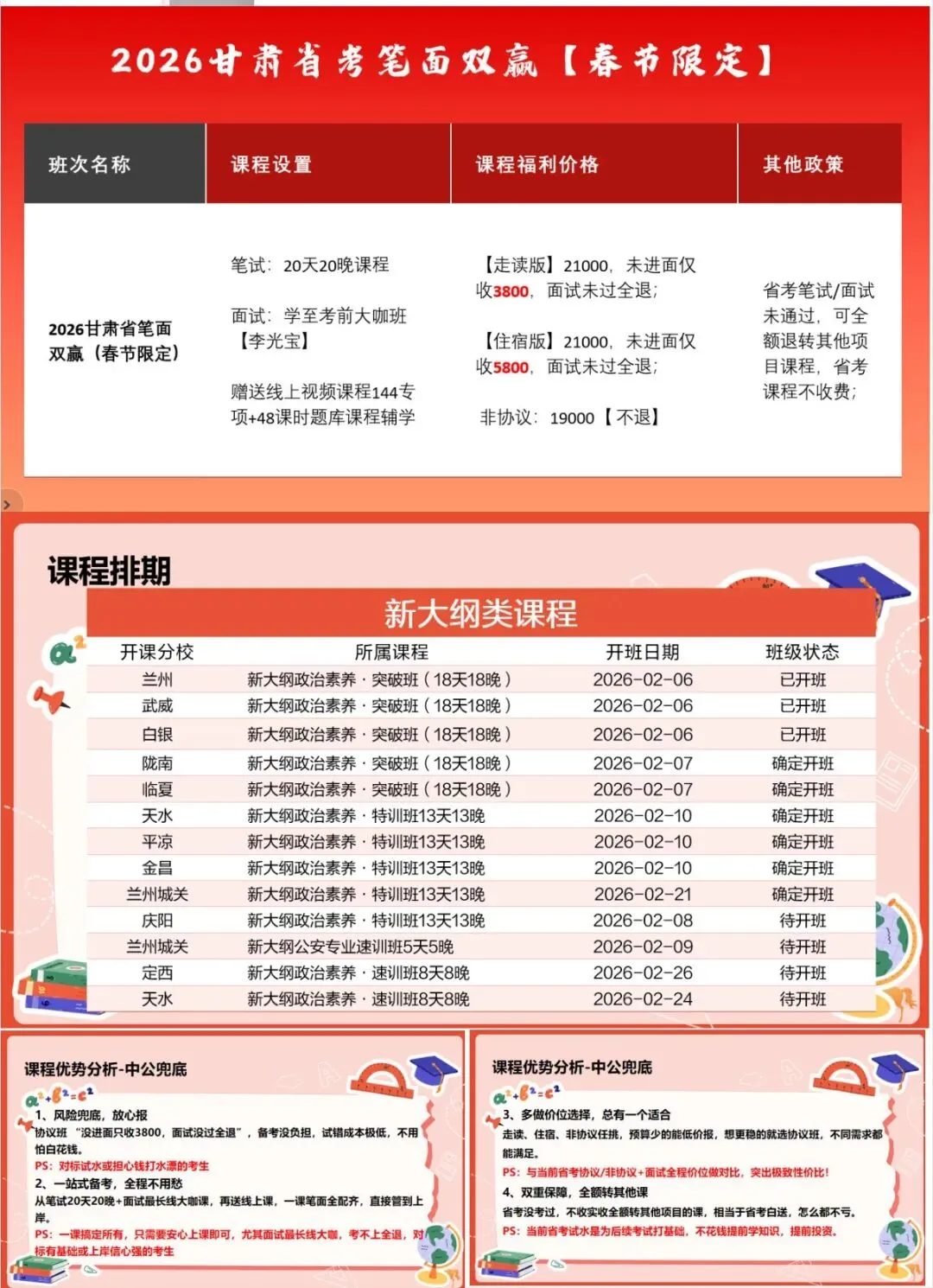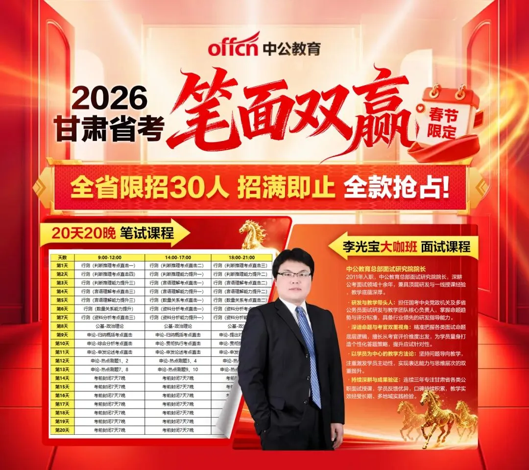 甘肃省考近期开课安排:✅ 20天20晚高效冲刺张掖:2月8日城关/甘南:2月9日酒泉:2月10日