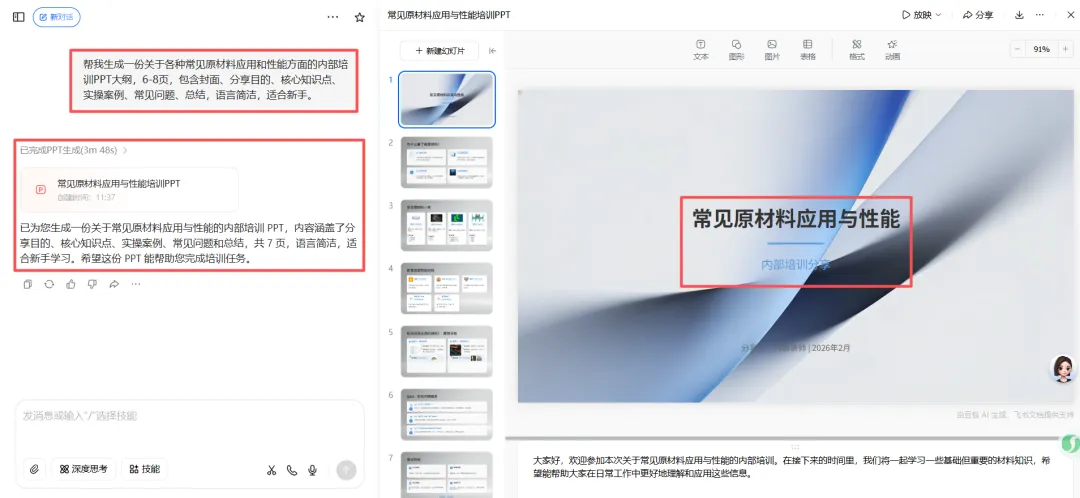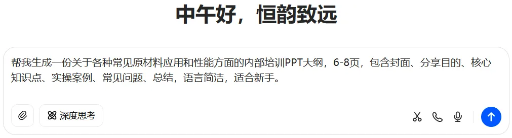 直接复制发给AI:帮我生成一份关于(内容可以自己填)内部培训PPT大纲,6-8页,包含封面、分享目的、核心知识点、实操案例、常见问题、总结,语言简洁,适合新手。