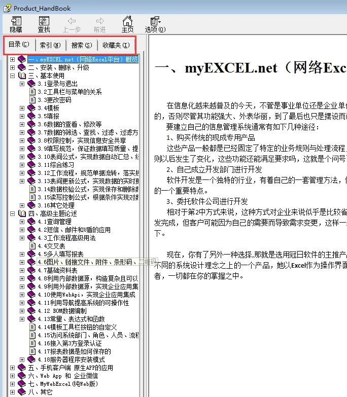 使用手册有两个版本,一个是我们安装软件后,在开始菜单的Myexcel列表中,会有一个CHM格式的使用手册,在官方网站上还有一个PDF格式的使用手册,可以下载。两个版本都是同步发行,内容完全一样。