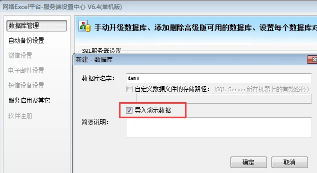 如果我们已经安装完成了Myexcel,也可以在“服务端设置中心”新建一个演示数据库,我们只要在新增数据库时,勾选这个选项即可。