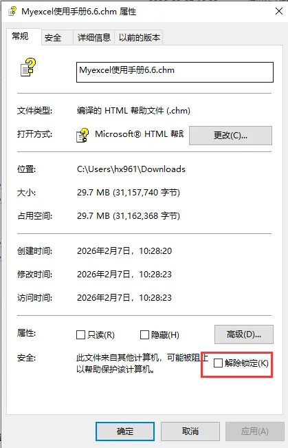 第三、四个是Myexcel使用手册两种格式的文件。这儿要注意一下,chm文件有时下载打开后,会没有内容,这时,需要我们在这个chm文件上点右键,选“属性” 把“解除锁定” 勾上就可以了。