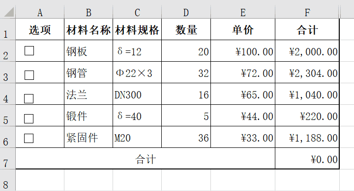 你会不会设计上面这种含有复选框的动态表格?被选中的行自动高亮显示,并将选中的值自动合计到最后一行的合计单元格中。可以将未选中的行隐藏后打印输出。下面,我来一步一步教你如何设计这种表格。