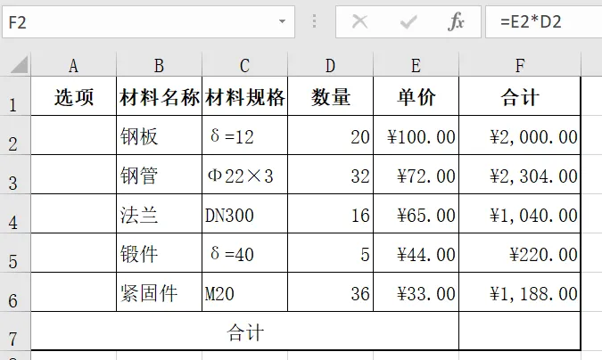 第1步:设计好表格,F2单元格中输入公式=E2*D2,将公式向下填充到F6单元格。