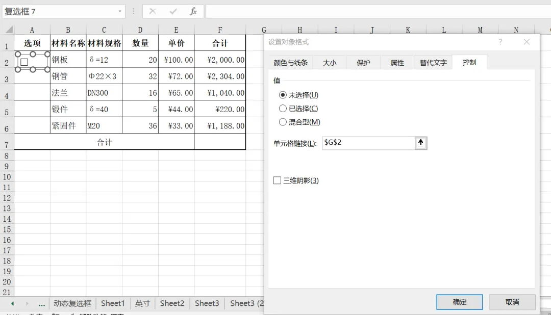 然后选中复选框,点击鼠标右键,切换到弹出对话框的“控制”栏,在“单元格链接”对话框中输入$G$2(或点击对话框右边的黑色箭头,点击表格中的G2单元格,按键盘回车键),最后点击确定。