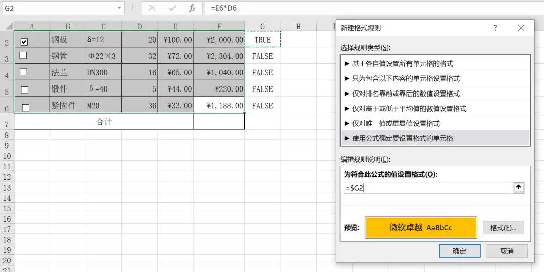 点击“新建规则”,在“规则类型中”选择最后一个“使用公式确定要设置格式的单元格”。在“符合此公式的值设置格式(O):”中输入$G2(或点击对话框右边的黑色箭头,点击表格上的G2单元,通过按键盘上F4键切换到$G2)。点击“格式”按钮,为选中复选框后需要高亮显示的行设置一个格式,可以是字体颜色,字体,也可以是填充颜色,本例中我选择填充颜色。