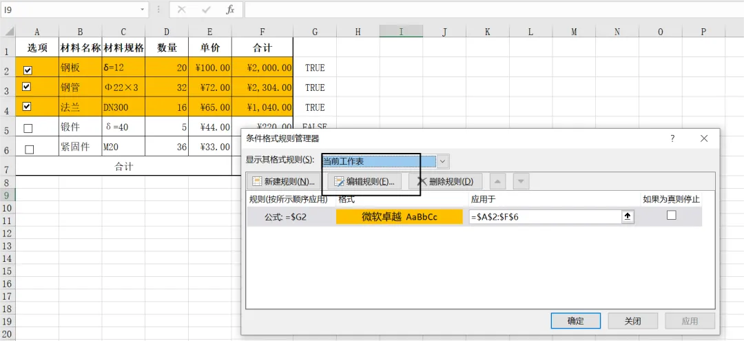 (2) 有些时候因其他原因,“符合此公式的值设置格式(O):”中的$G2会发生变化,导致格式设置失败,此时再次进入条件格式,管理规格中编辑规则,将其改为$G2即可