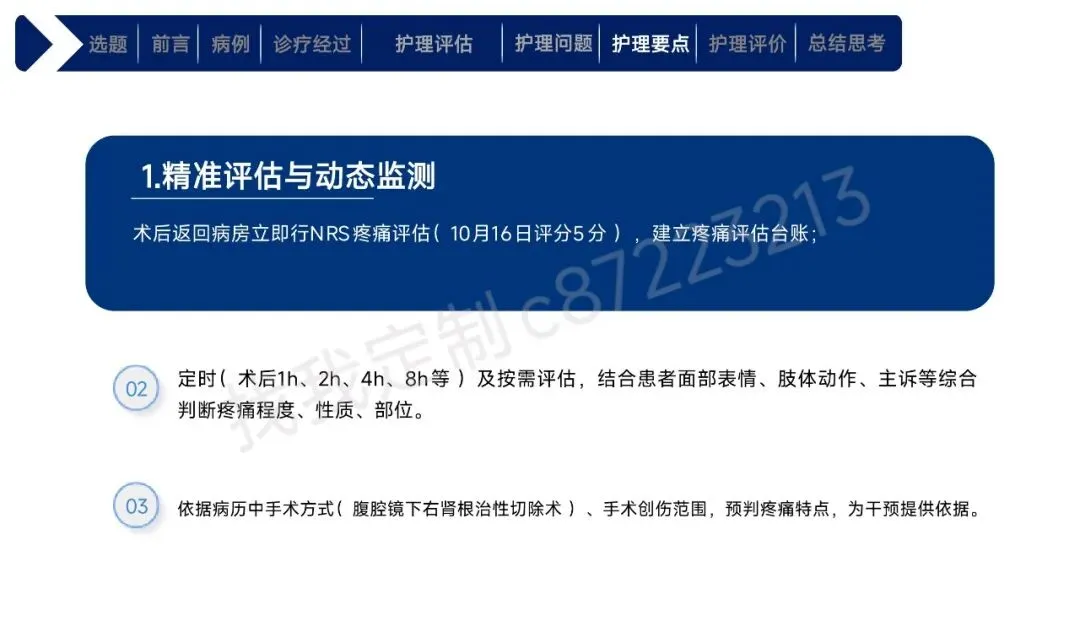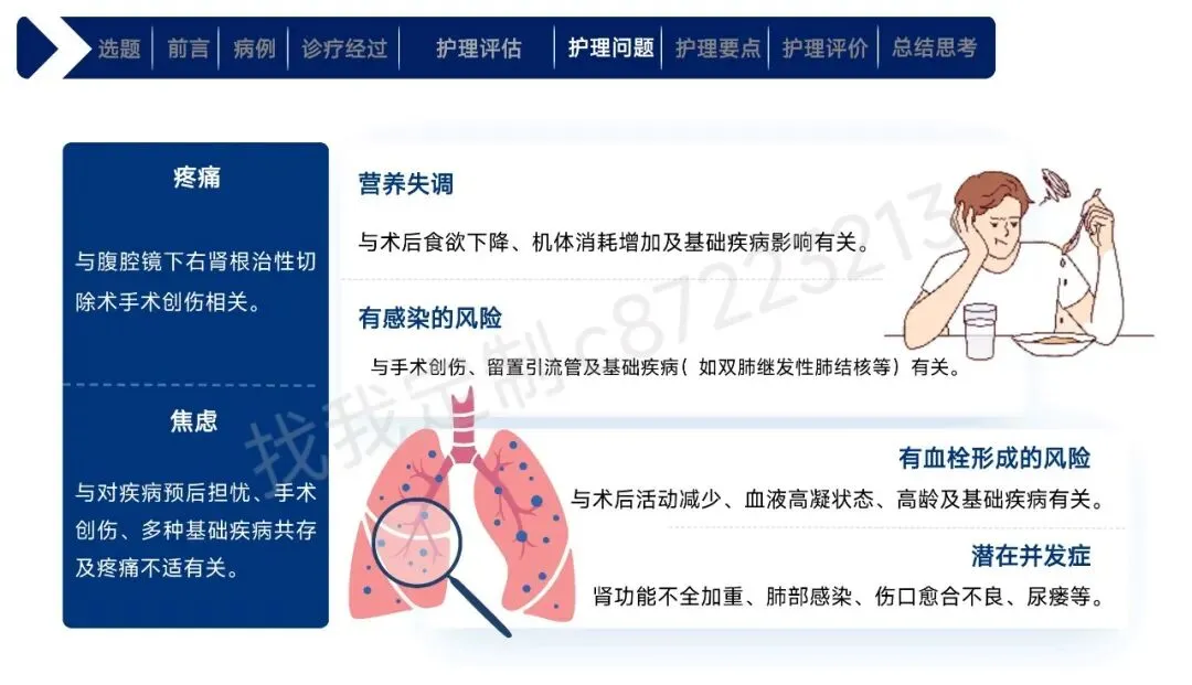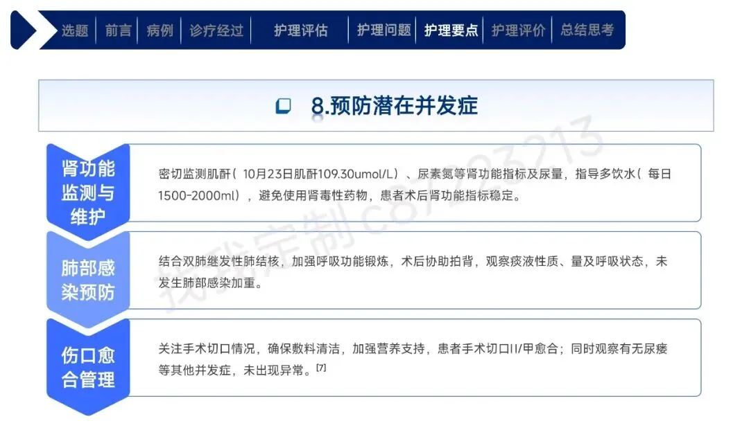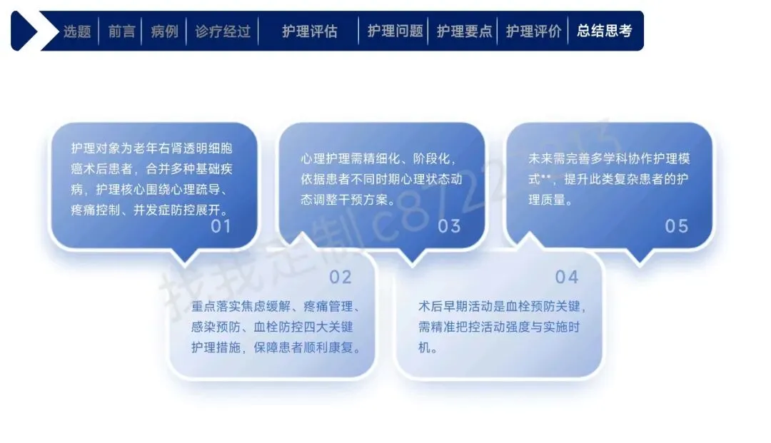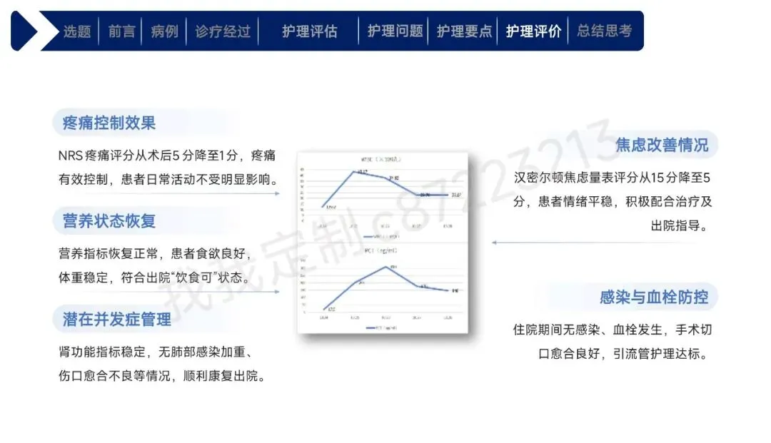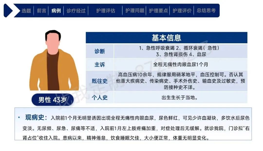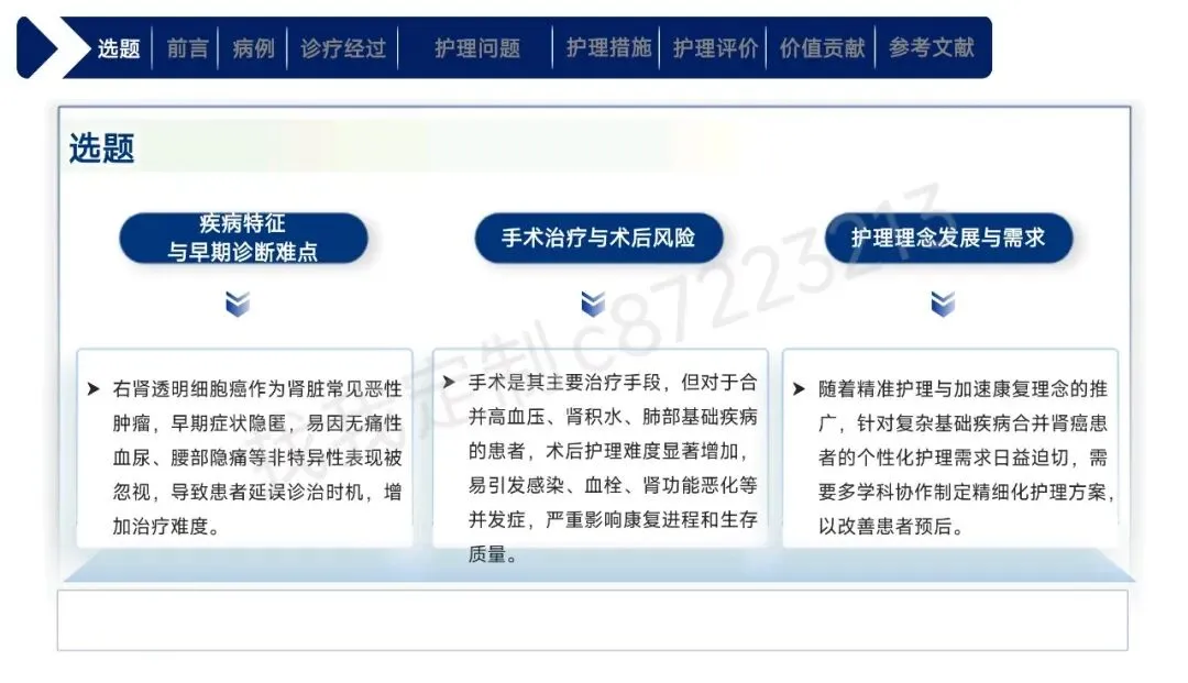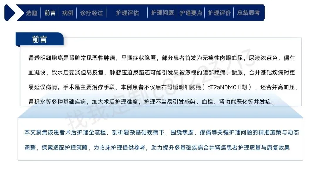 本课件围绕1例43岁合并高血压、肾积水等基础疾病的右肾透明细胞癌Ⅱ期患者术后护理展开,总结以患者为中心的全周期护理经验。患者行腹腔镜下右肾根治性切除术,护理团队通过动态评估确定其存在疼痛、焦虑、营养失调及感染、血栓等并发症风险。护理中实施精准化干预:阶梯化止痛结合非药物手段控制疼痛,个性化沟通与家属支持缓解焦虑,联合营养科制定饮食方案改善营养,同时做好切口、引流管护理预防感染,通过早期活动与抗凝监测防控血栓,还密切监测肾功能、呼吸状态预防潜在并发症。最终患者各项评估指标显著改善,无并发症发生并顺利出院。研究表明,针对合并基础疾病的肾癌术后患者实施针对性、精细化的护理措施,能有效促进康复,也为临床同类患者护理提供了参考。