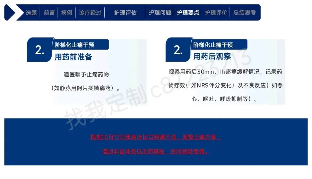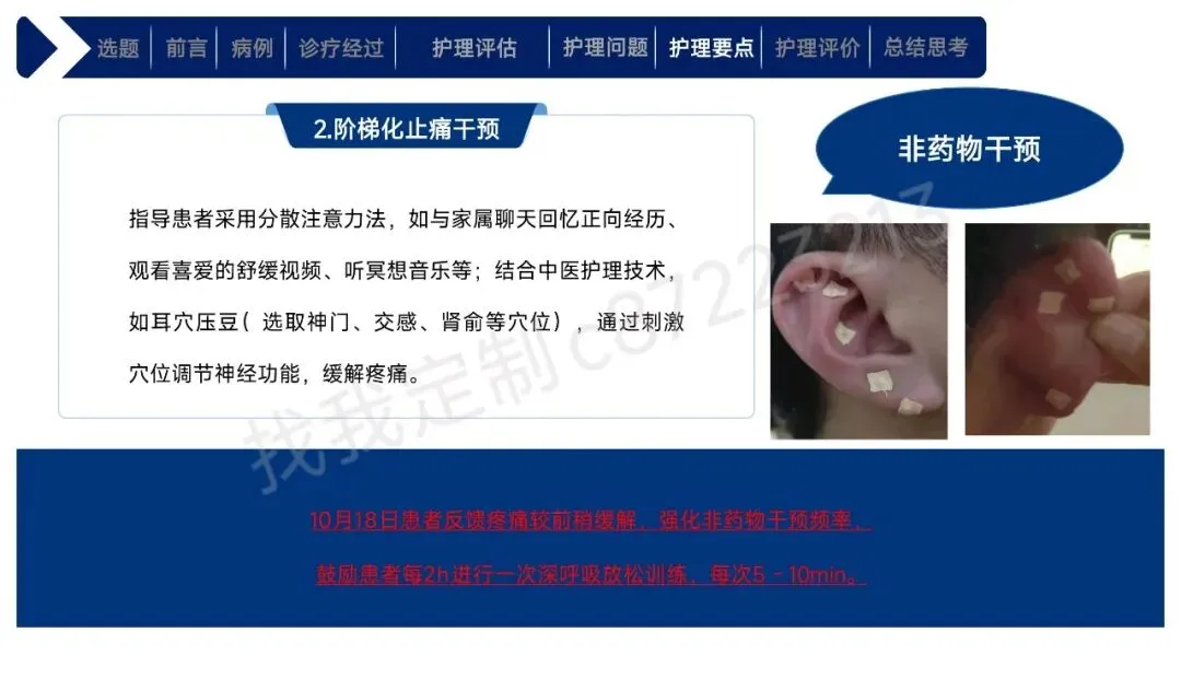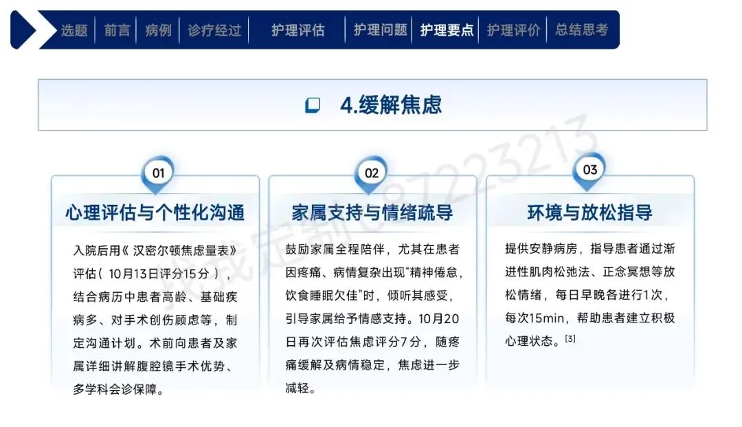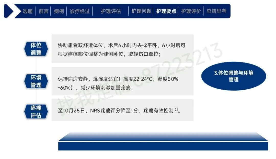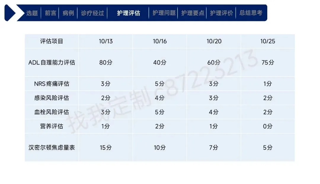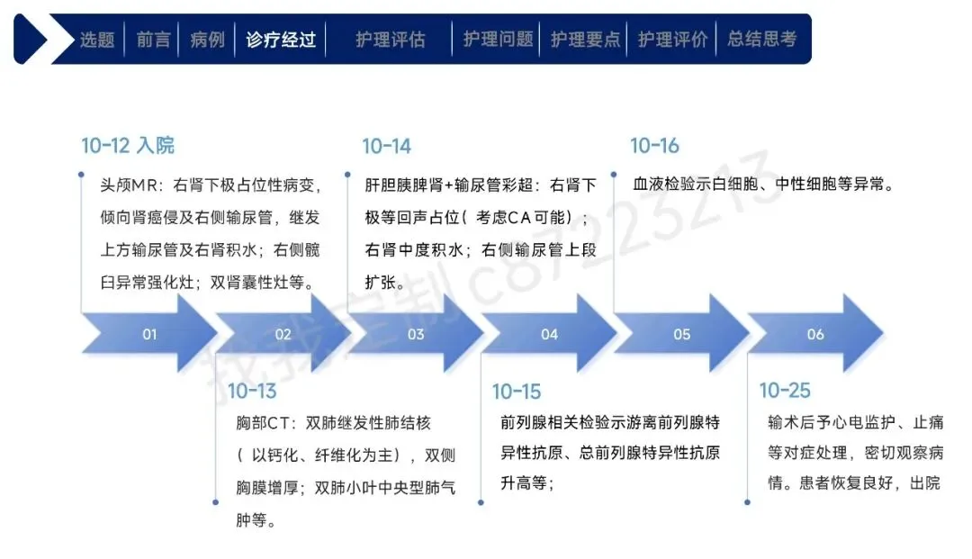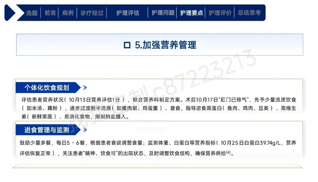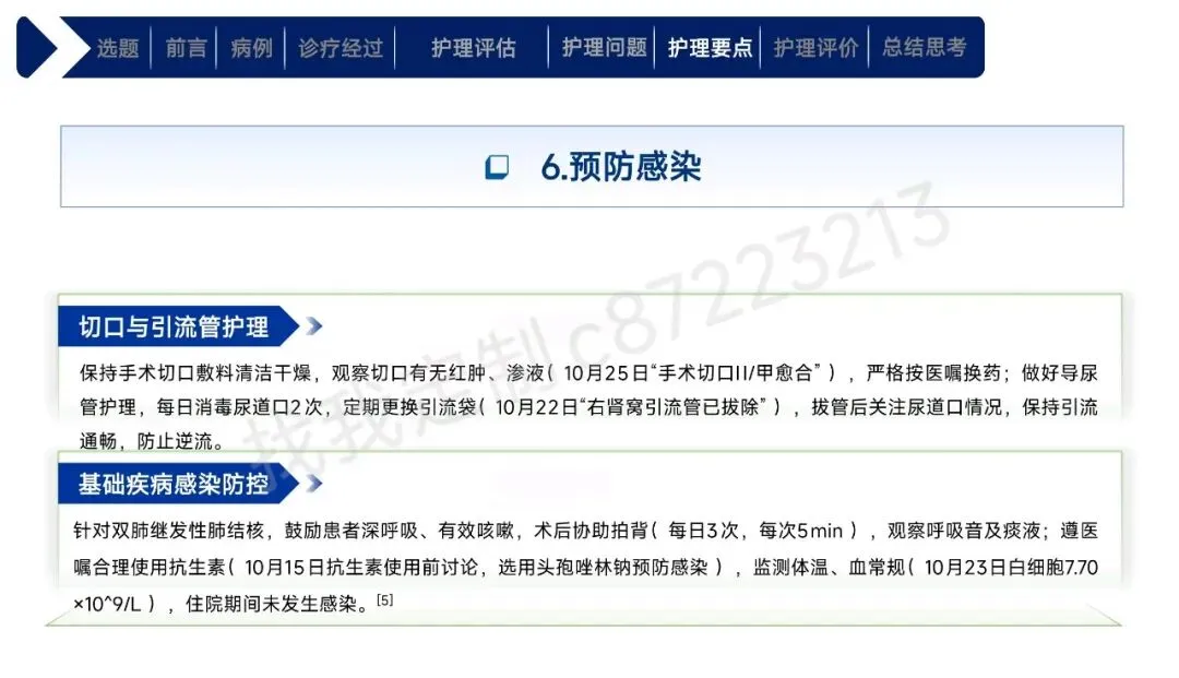 本课件围绕1例43岁合并高血压、肾积水等基础疾病的右肾透明细胞癌Ⅱ期患者术后护理展开,总结以患者为中心的全周期护理经验。患者行腹腔镜下右肾根治性切除术,护理团队通过动态评估确定其存在疼痛、焦虑、营养失调及感染、血栓等并发症风险。护理中实施精准化干预:阶梯化止痛结合非药物手段控制疼痛,个性化沟通与家属支持缓解焦虑,联合营养科制定饮食方案改善营养,同时做好切口、引流管护理预防感染,通过早期活动与抗凝监测防控血栓,还密切监测肾功能、呼吸状态预防潜在并发症。最终患者各项评估指标显著改善,无并发症发生并顺利出院。研究表明,针对合并基础疾病的肾癌术后患者实施针对性、精细化的护理措施,能有效促进康复,也为临床同类患者护理提供了参考。