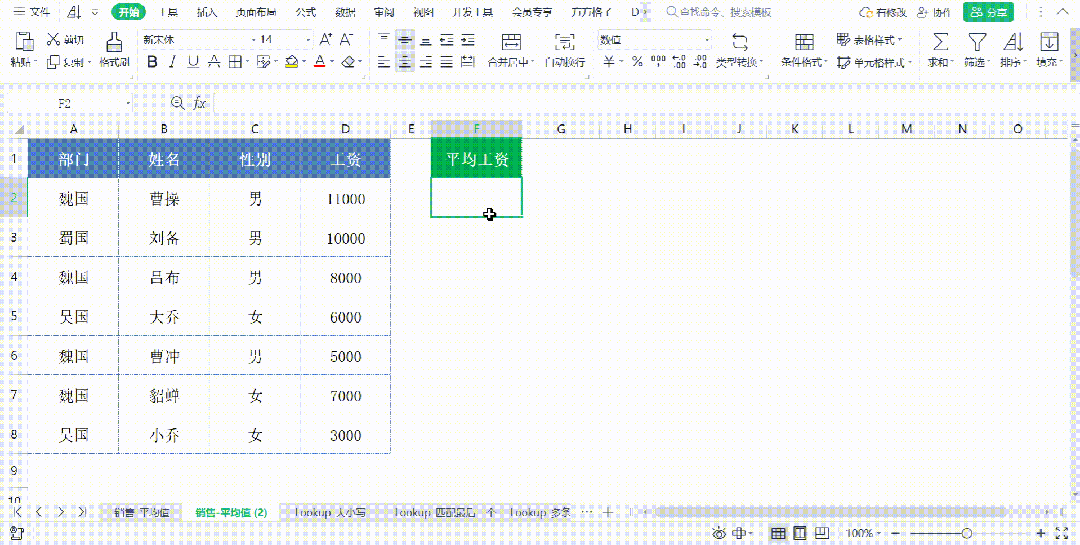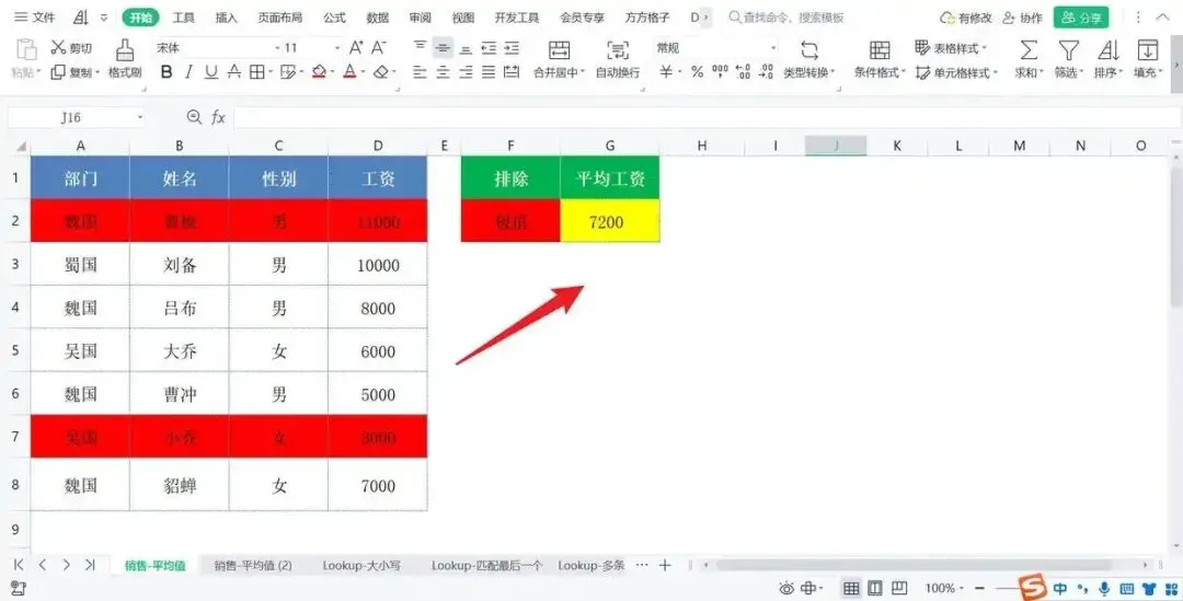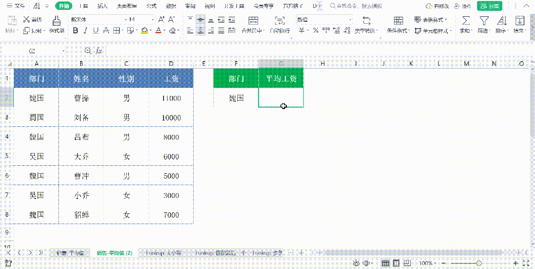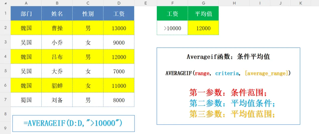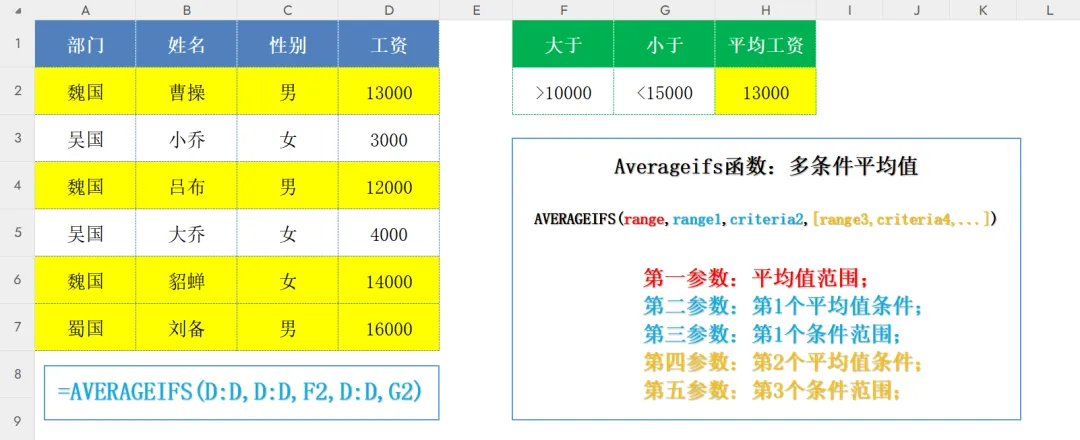 这里,D:D代表工资列,A:A和F2组合成部门条件(魏国),C:C和G2则构成性别条件(男性)。