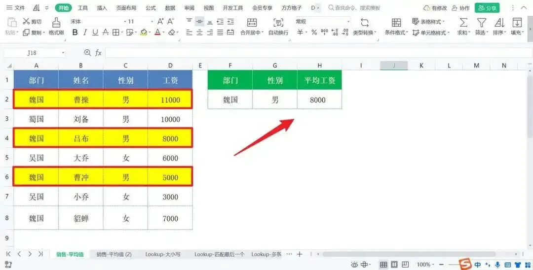 面对更复杂的计算需求,如需要同时满足多个条件时,AverageIfs函数便显得尤为重要。继续以员工工资表格为例,若需计算魏国男性员工的平均工资,可在目标单元格(如H2)中输入公式:↓