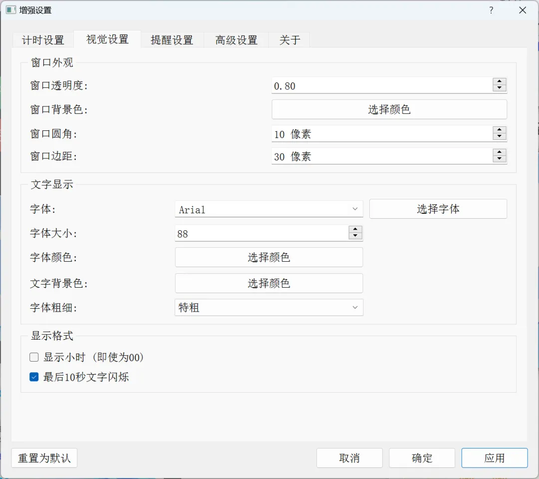 还可以设置窗口透明度、背景色、字体大小、字体颜色,设置最后10秒文字闪烁提醒。