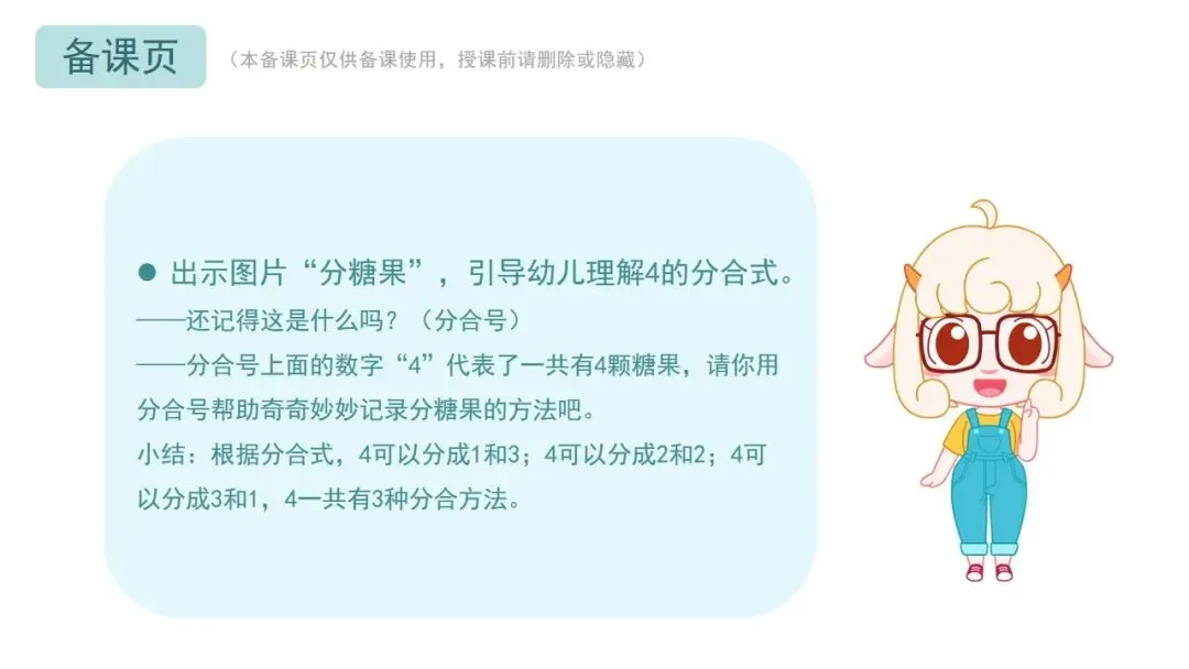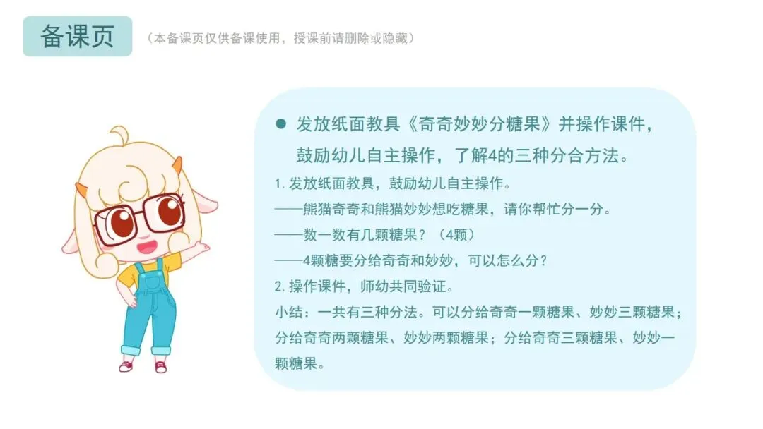 发放纸面教具《奇奇妙妙分糖果》并操作课件,鼓励幼儿自主操作,了解4的三种分合方法。