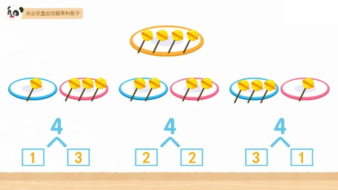 出示图片“分糖果”,引导幼儿理解4的分合式。