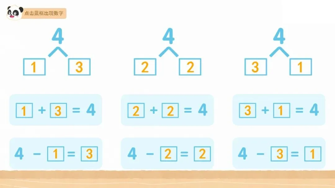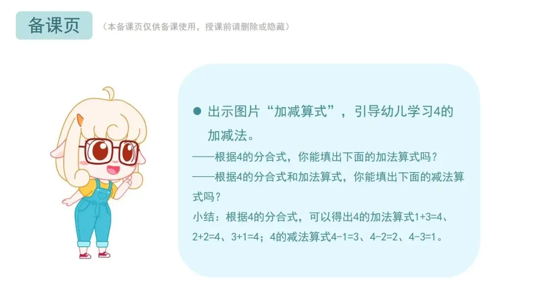 小结:根据4的分合式,可以得出4的加法算式1+3=4、2+2=4、3+1=4;4的减法算式4-1=3、4-2=2、4-3=1。