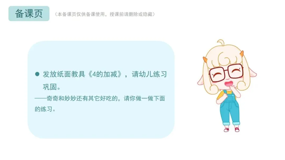 发放纸面教具《4的加减》,请幼儿练习巩固。