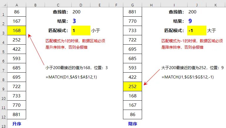 =INDEX(A1:A12,MATCH(D1,A1:A12,1) → 返回 168=INDEX(G1:G12,MATCH(J1,G1:G12,-1) → 返回 252