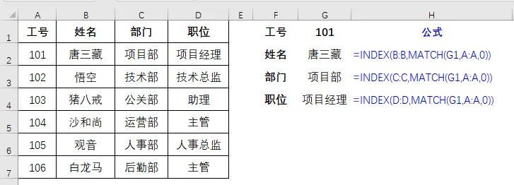 =INDEX(B:B,MATCH(工号, A:A,0)) # 姓名=INDEX(C:C,MATCH(工号, A:A,0)) # 部门=INDEX(D:D,MATCH(工号, A:A,0)) # 职位
