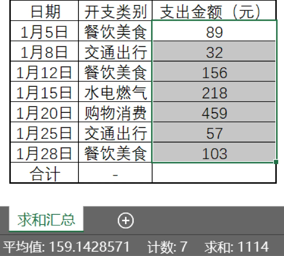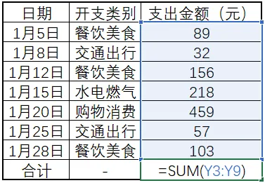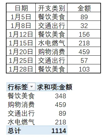 选中数据区域,插入【数据透视表】,将“分类字段”拖至行/列,“求和字段”拖至值区域(默认求和)。如图:“开支类别”拖至行,“金额”拖至值区域。完成汇总求和。