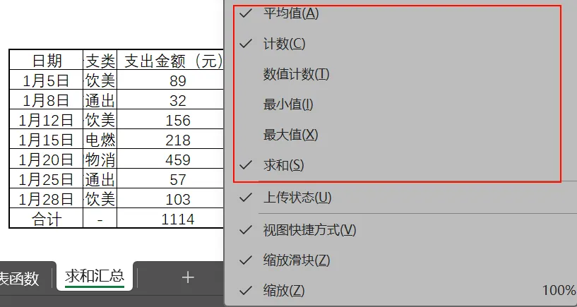 直接选中需要的单元格。Excel界面右下角状态栏直接显示平均值、计数、求和结果。右键状态栏可以选择需要的统计项。
